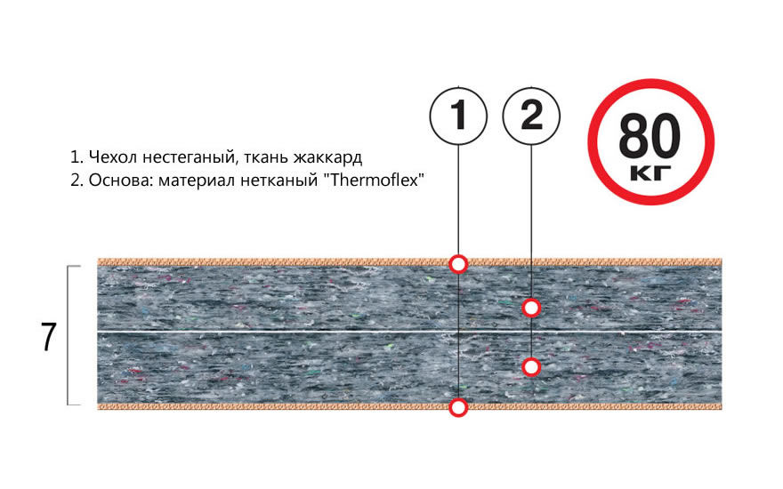 "Thermoflex" - це плита з відновлених волокон бавовни, вовни і ПЕТ волокон, його пружна, об'ємна структура з ущільнених горизонтальних шарів збільшує висоту матраца, а також рівномірно розподіляє навантаження.
