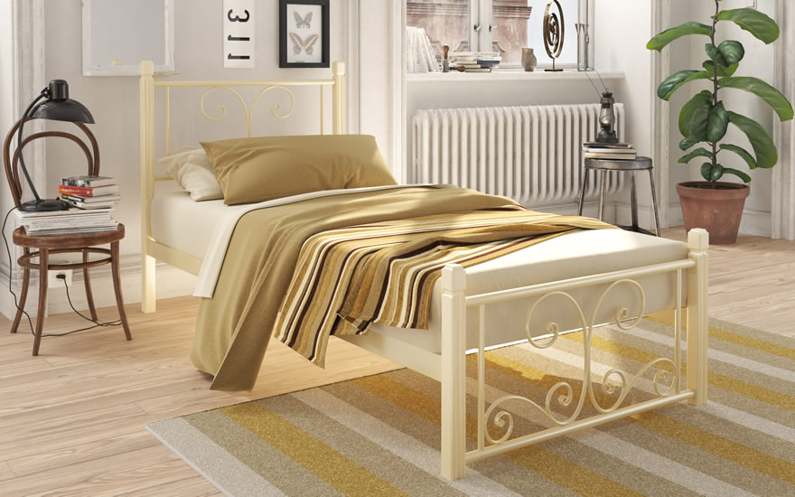 • Металеве односпальне ліжко Нарцис міні безумовно стане прикрасою спальні. В цьому ліжку витонченість металу гармонійно поєднується з теплотою і красою натурального дерева. Прості, елегантні лінії узголів'я і узножжя пом'якшуються легкими віньєтками з металевих прутів. Дерев'яні різьблені стійки самі по собі прикрашають ліжко, а також надійно підтримують каркас.