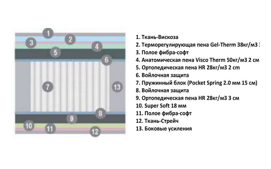 Порожнє фібра-софт, прокладене між пінними матеріалами сприяють додаткової циркуляції повітря, так як складається з безлічі пустотілих волокон, які забезпечують постійний повітрообмін, регулюють термобаланс і вирівнюють перепади температури під час сну. |