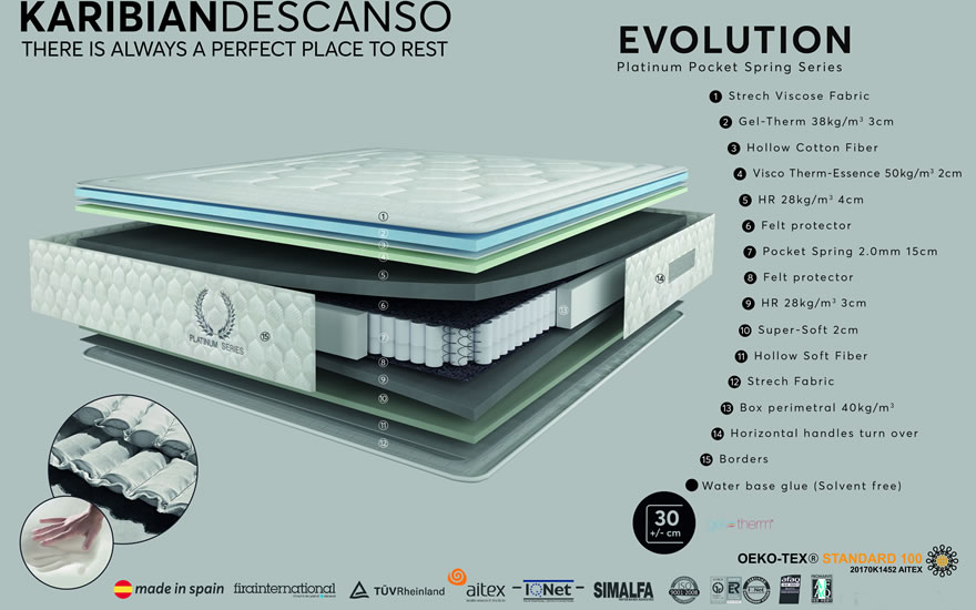 Матрац Evolution - матрац з анатомічним, ортопедичним і ергономічним ефектом - зонування матраца (7 зон відпочинку) створює необхідну підтримку в місцях найбільшого тиску. Основа матраца - незалежний пружинний блок Pocket Spring 2 мм (15 см). Поєднання незалежного пружинного блоку Pocket Spring 2 мм (15 см) і суперсучасних пінних матеріалів з різною щільністю і еластичністю забезпечить не тільки оптимальну підтримку всьому хребту, а й абсолютне розслаблення всіх груп м'язів.