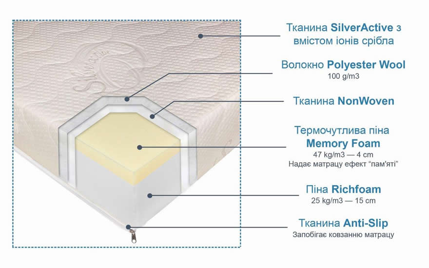 Нижній шар матраца виготовлений з щільного пінополіуретану з антибактеріальними властивостями "Richfoam", які перешкоджають розвитку бактерій і пилових кліщів. Висота шару пінополіуретану - 150 мм. |