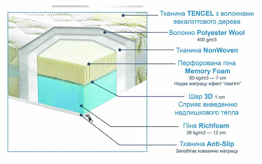 Стьобаний чохол матраца виготовлений з інноваційної тканини на основі целюлози евкаліптового дерева з Тенцель. Чохол має гладку шовковисту поверхню. Підкладкова сторона чохла - спеціальна тканина «анти-сліп», що запобігає ковзанню матраца. |