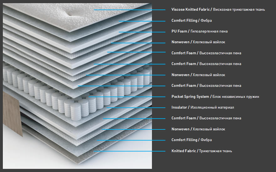 Comfort Filling / Фібра - дуже пружний матеріал, який миттєво відновлює свою форму після стискання. Не вбирає вологу, тому в ньому немає умов для життя мікроорганізмів, а значить, і його гігієнічні властивості дуже високі. |