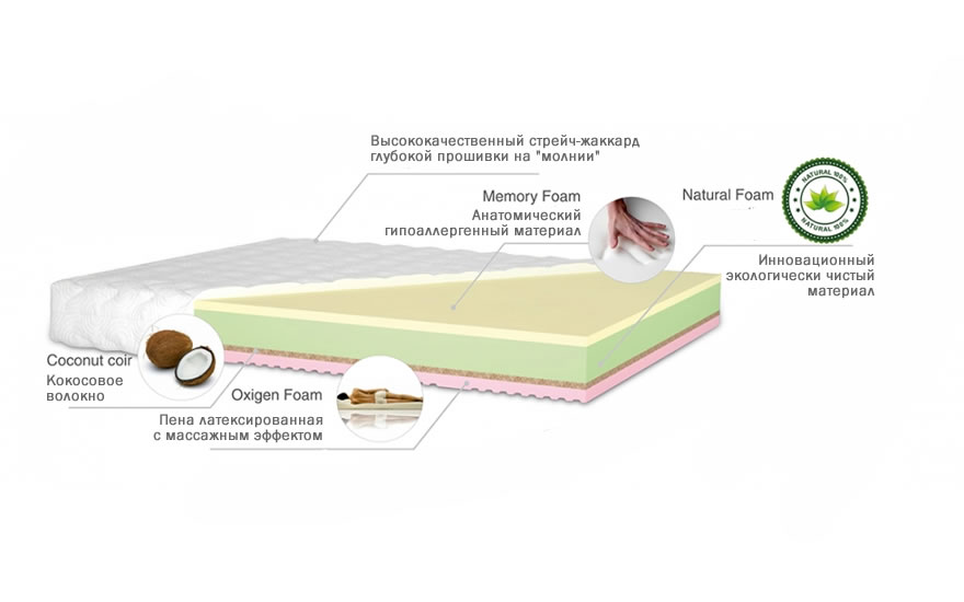 Піна Memory Foam - матеріал, що містить комірки з «пам'яттю», реагує на температуру і вагу людини, в точності повторюючи форму тіла. Використання такої піни в два рази знижує тиск голови, стегон, плечей, колін і стоп. Рекомендується експлуатувати в приміщенні з темературою не менше 20С.
