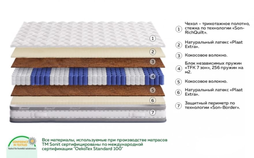 В якості наповнення з обох сторін матраца використовується натуральний перфорований латекс "Plaat Extra Soft" в поєднанні з кокосовим волокном. Натуральний латекс - пружний і еластичний матеріал, який перешкоджає здавленню м'яких тканин, сприяє вільному доступу кровотоку, знімає больові відчуття і дарує здоровий глибокий сон. Кокосове волокно підсилює корисні властивості латексу, підвищуючи жорсткість матраца до оптимального рівня, для дбайливої підтримки хребта. |