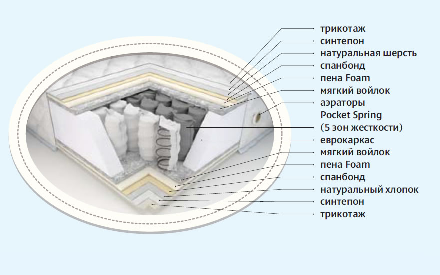 • Основа ортопедичного матраца Pragmatic - блок незалежних пружин Pocket Spring з п'ятьма зонами жорсткості: голови, плечей і лопаток, попереку, тазостегнової області, гомілки і стоп. Завдяки своїй високій точкової еластичності Pocket Spring має високі ортопедичні та анатомічні властивості. В даному блоці кожна пружинка зашивається в окремий текстильний кишеньку, з'єднаний з сусідніми кишеньками. Згруповані таким чином зональні пружини дозволяють досягти високої точкової гнучкості і, як наслідок, забезпечують природне положення тіла і додаткову підтримку в області попереку.