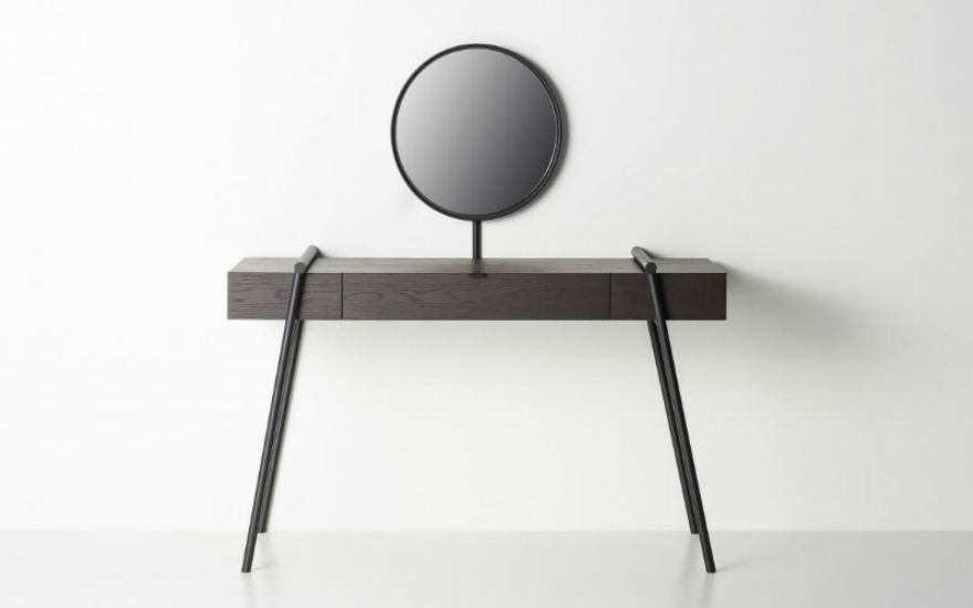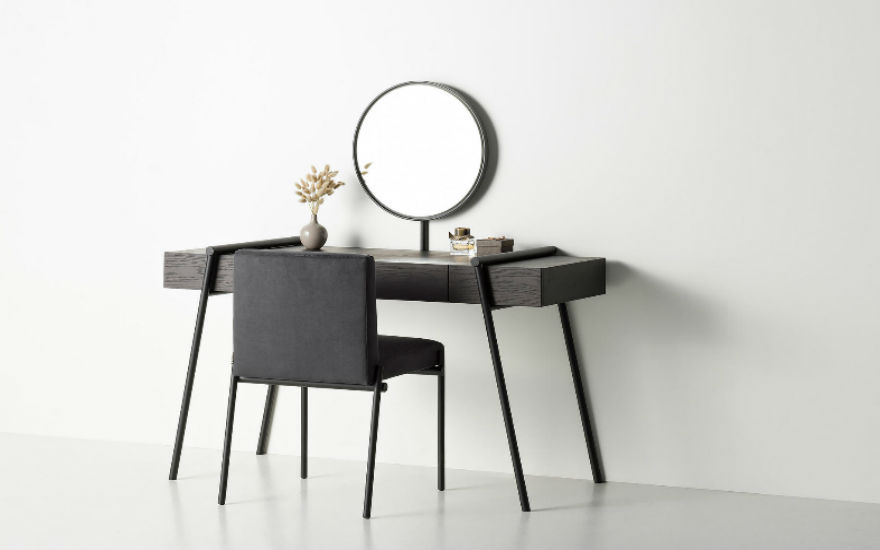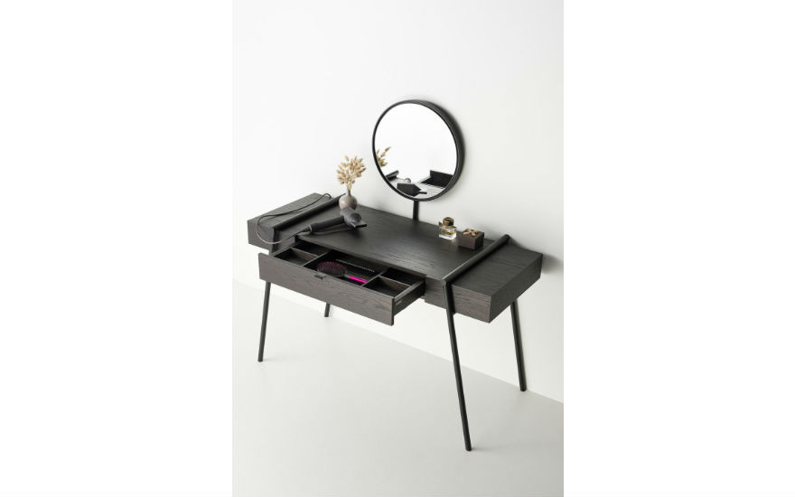 • Туалетний стіл Duoo -  прекрасний приклад простого, але елегантного дизайну. Зручний, висувний ящик ідеально підходить для зберігання невеликих повсякденних речей і прикрас. Видимі деталі облицьовані натуральним шпоном дуба, що надає виробу чудову текстуру, а тонкі, нахилені металеві ніжки задають сучасний вид всьому виробу. Прекрасним доповненням до туалетного столика буде дзеркало круглої форми, що входить в комплект.